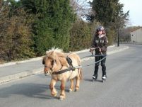 Les enfants se font tirer par un poney shetland avec leurs propre rollers .